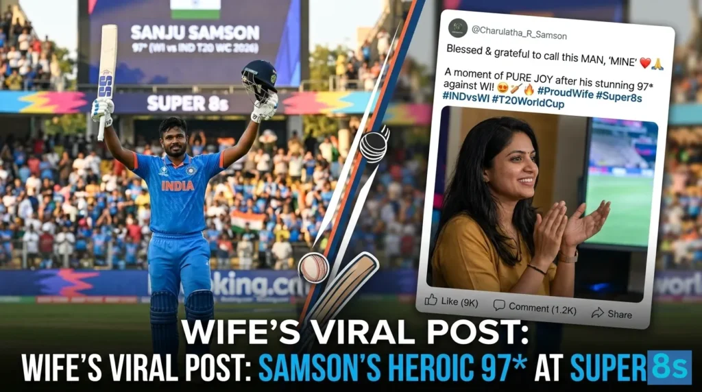 Indeed, Sanju Samson’s match-winning unbeaten 97 off 50 balls featuring 12 fours and four sixes that led India to a five-wicket victory over West Indies with four balls to spare, securing their T20 World Cup 2026 semi-final spot at Eden Gardens on March 1, prompted his wife Charulatha Remesh to share a heartfelt Instagram post celebrating “some moments have to be accepted not explained” as her husband set the record for the highest score by an Indian in a successful T20 World Cup run chase.